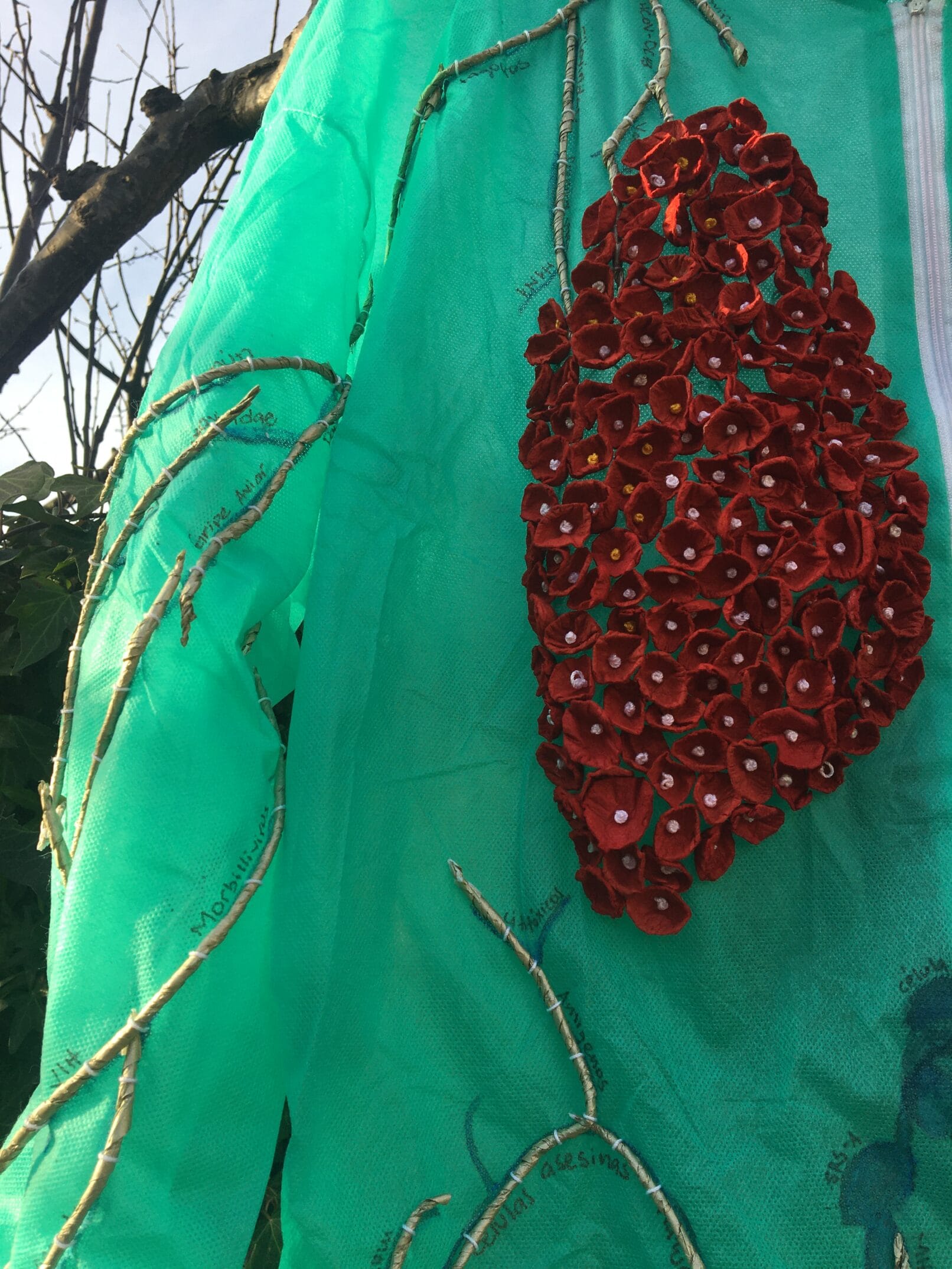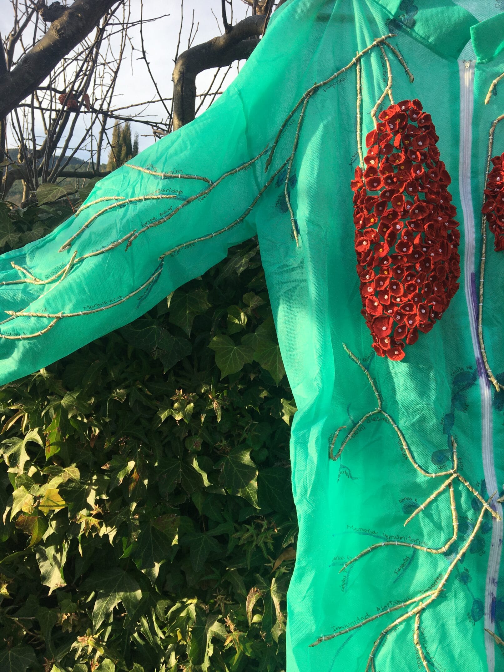 El traje de hospital Linfa ha sido bordado a mano con hilos y papel que reproduce el sistema linfático, es una obra única y significativa.