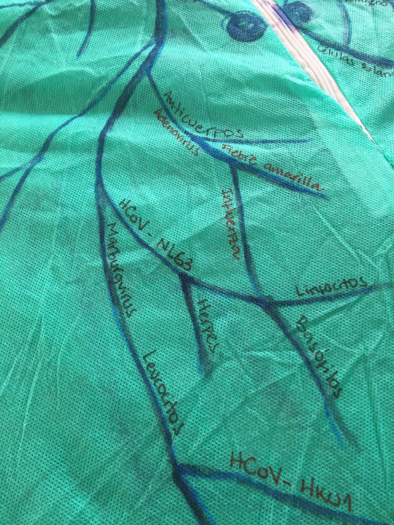 El traje de hospital bordado a mano Linfa es una pieza única que forma parte de la serie de obras titulada Pandemia.